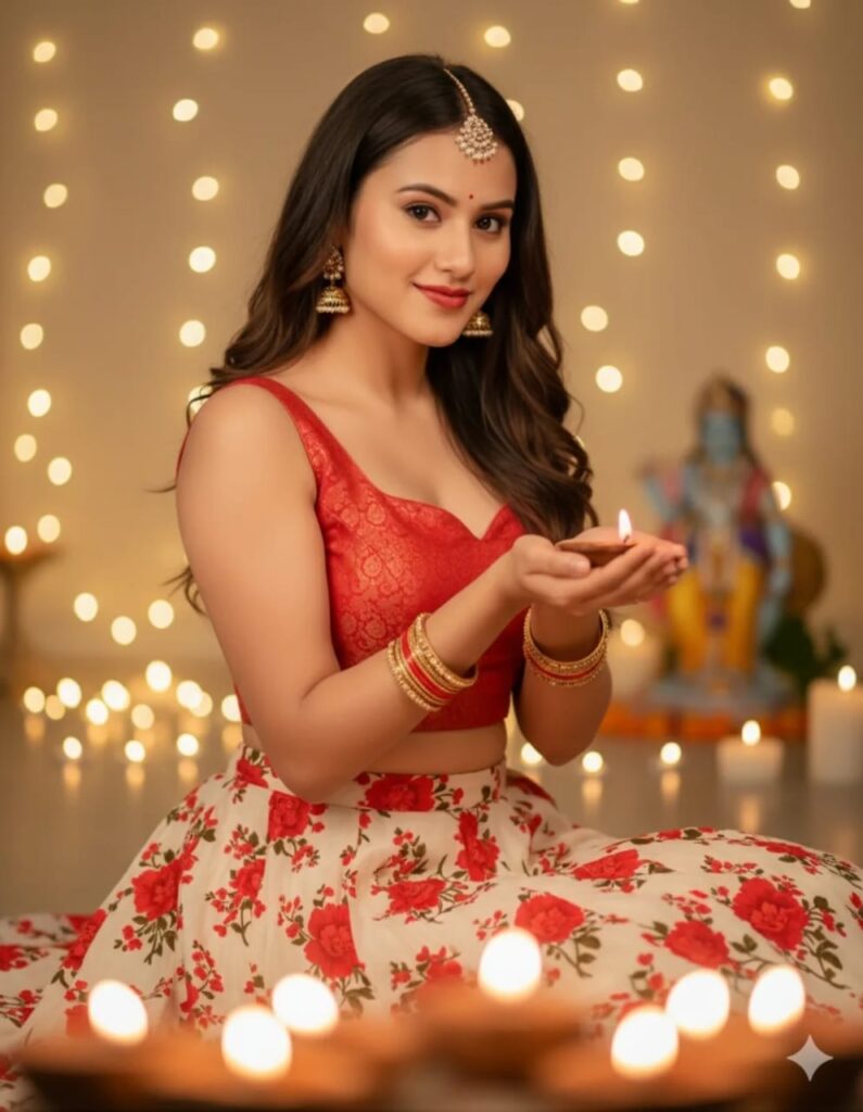 PROMTS – A beautiful young Indian woman in traditional festive attire, wearing a red stylish sleeveless blouse and a cream lehenga with bright red floral prints. She is sitting gracefully, holding a decorated brass thali filled with lit diyas (oil lamps) in both hands. Her head is slightly tilted, with a gentle smile and expressive eyes looking towards the camera. She has long wavy hair styled to one side, adorned with a maang tikka, earrings, and golden bangles.The background features warm glowing fairy lights, candles, and a blurred Radha Krishna idol, creating a devotional festive vibe. Foreground bokeh of glowing diyas adds depth. Cinematic photography, soft warm lighting, high detail, professional portrait style. For making this photo use the above photo and don’t change her face it should be exact same 100%”Change the pose