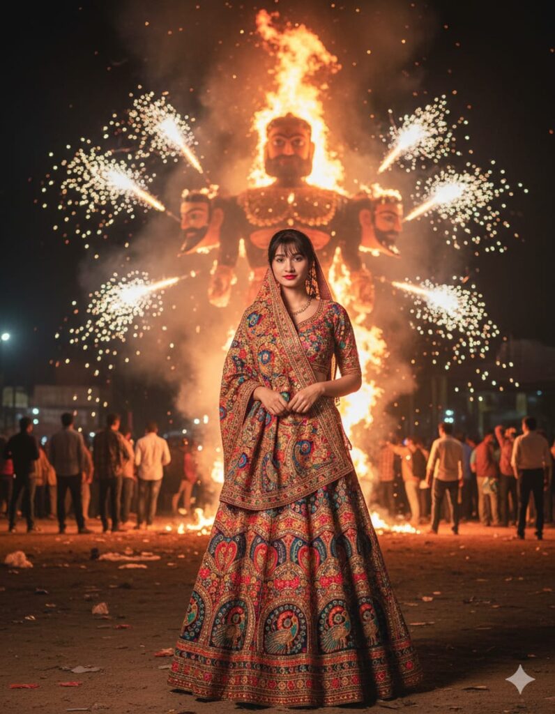 Promt – ”A full-body portrait of an Indian woman standing in front of a large, burning effigy of Ravana during the Dussehra festival at night. She is wearing a heavily embroidered, multi-colored traditional lehenga choli with intricate patterns and a matching dupatta. Sparklers and fireworks are erupting from the effigy, creating a dramatic and festive atmosphere. The ground is dusty, and there are blurred figures of people in the background, witnessing the celebration. The lighting is warm and dramatic, highlighting her attire and the fiery effigy Keep my face exactly the same as the uploaded photo. Do not change or edit my face.